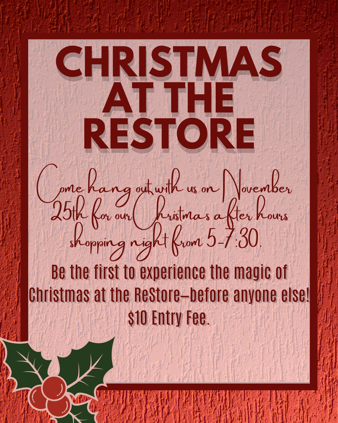 On November 25th, come get a first look at Christmas at the ReStore. We will have an after hours shopping night from 5-7:30PM.... MORE >