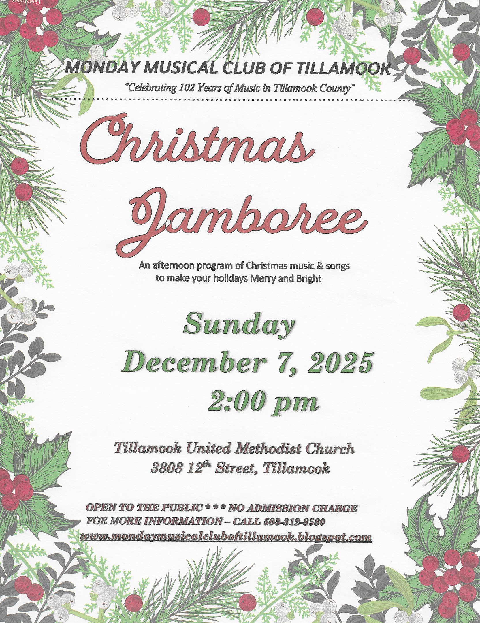 The Monday Musical Club of Tillamook will hold its December program “Christmas Jamboree” on Sunday afternoon December 7th a 2pm at the Tillamook... MORE >