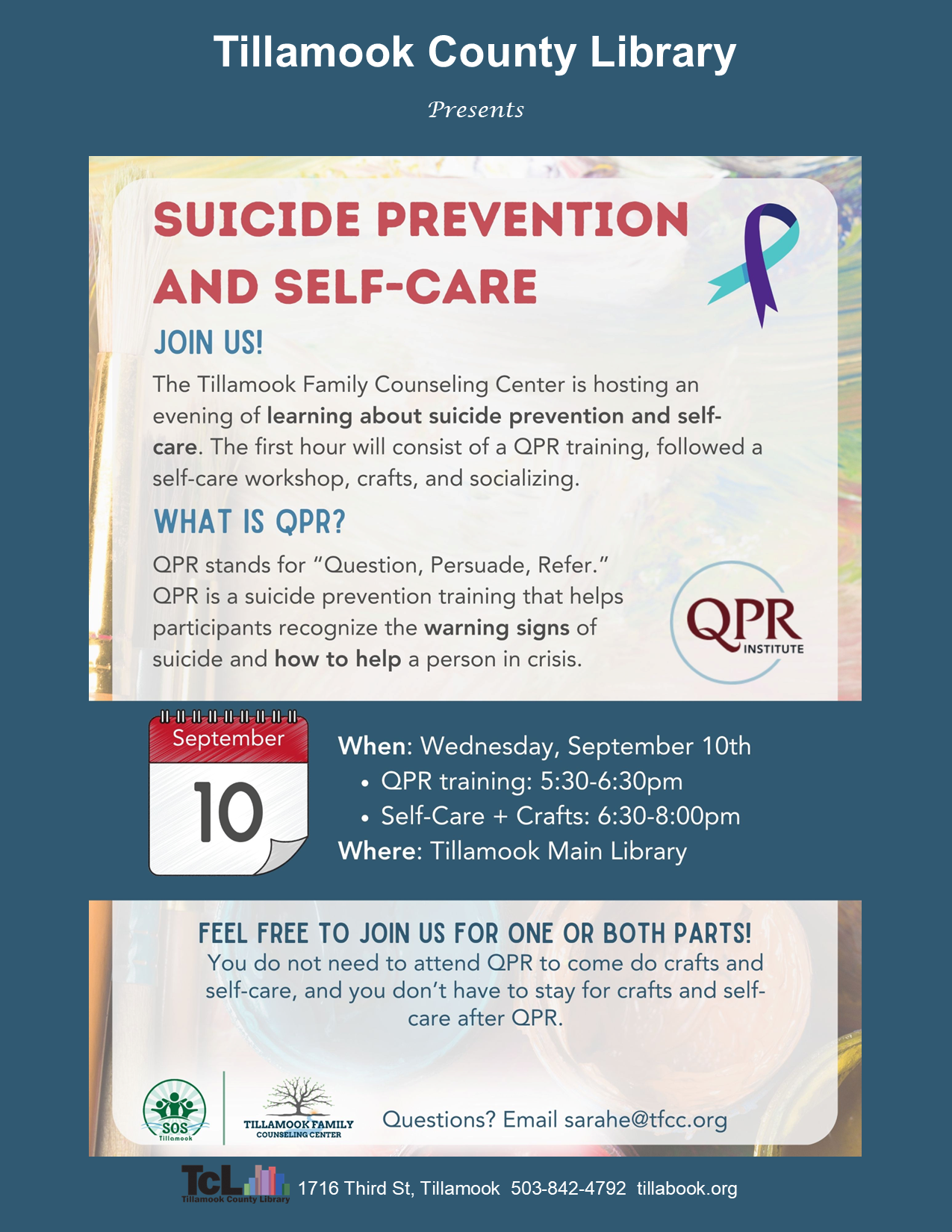 Join Tillamook Family Counseling Center for an evening of learning about suicide prevention and self-care at the library! MORE >