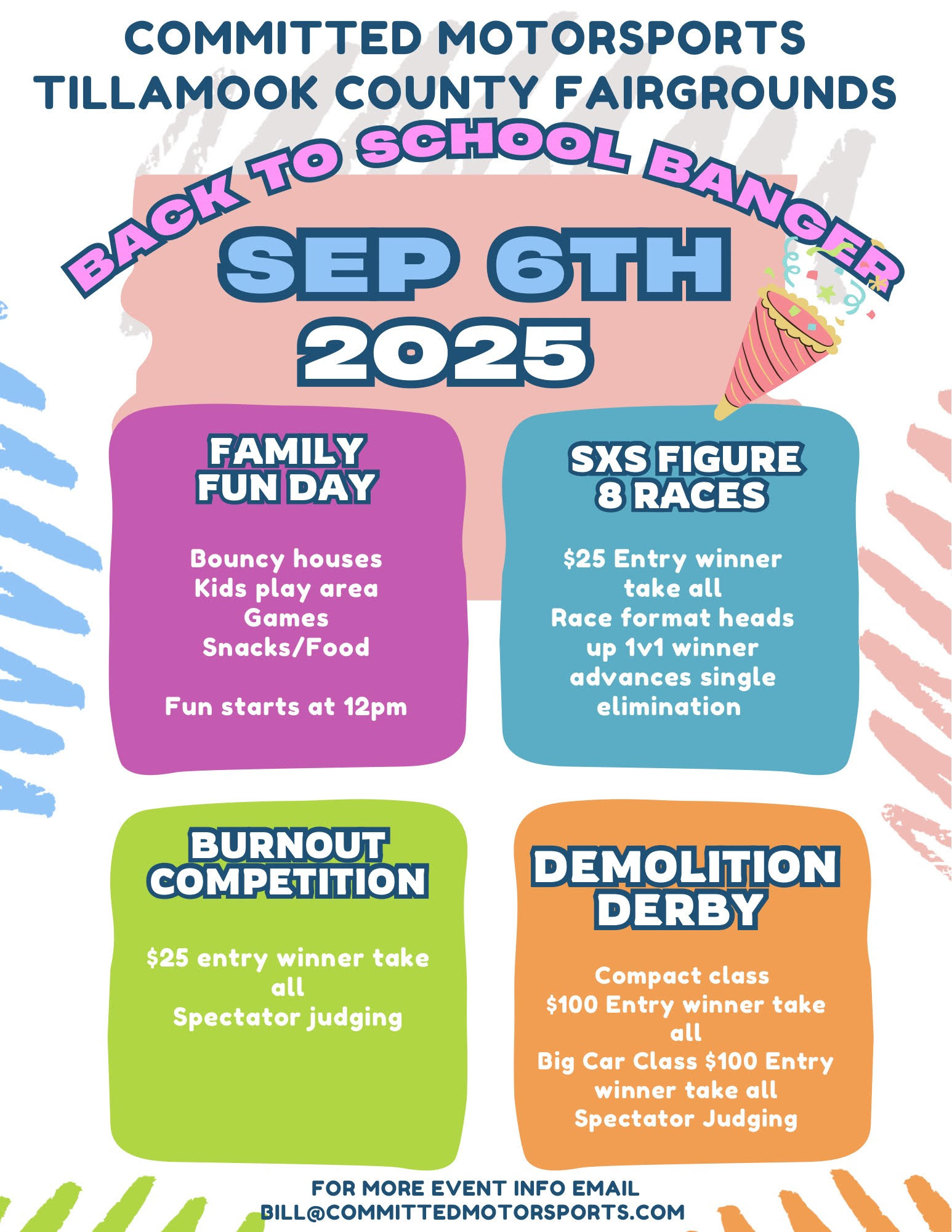 Kids/Family Fun, Bouncy Houses, Food, Drinks, Games, Car Show, Sxs Racing, Burnouts, Demolition Derby’s, and more Gates open at 12pm Vendors, Kids/Family fun,... MORE >